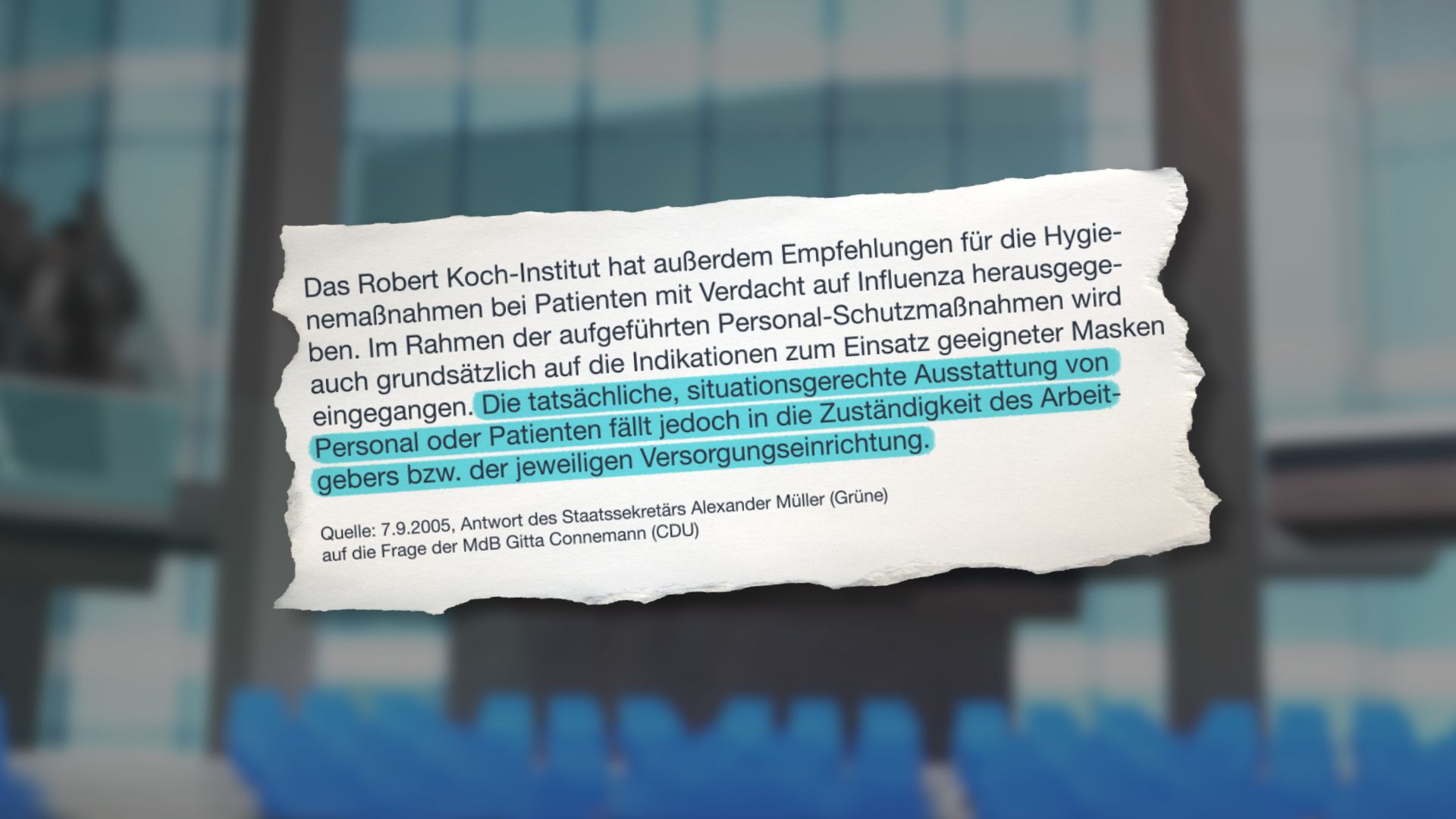 Nicht nur die WHO und Virologen warnten vor den Folgen einer drohenden Pandemie. Selbst das Robert-Koch-Institut – eine Behörde des Bundes – rechnete in einer Risikoanalyse aus dem Jahr 2012 mit Engpässen bei Schutzausrüstung und Arzneimitteln. Das Dokument lag auch dem Bundestag vor.
