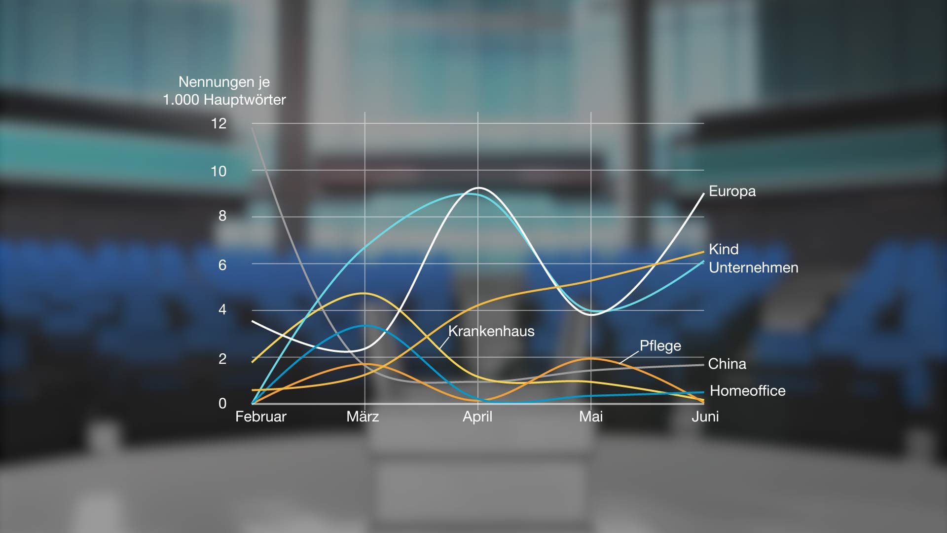 Andere wichtige Themen wie die Situation der Kinder und deren Eltern nahmen erst im April Fahrt auf, als die Corona-Maßnahmen bereits verschärft worden waren. Der Begriff Homeoffice hingegen kam früh auf und verlor – ähnlich wie „Krankenhaus“ – schnell wieder an Bedeutung.